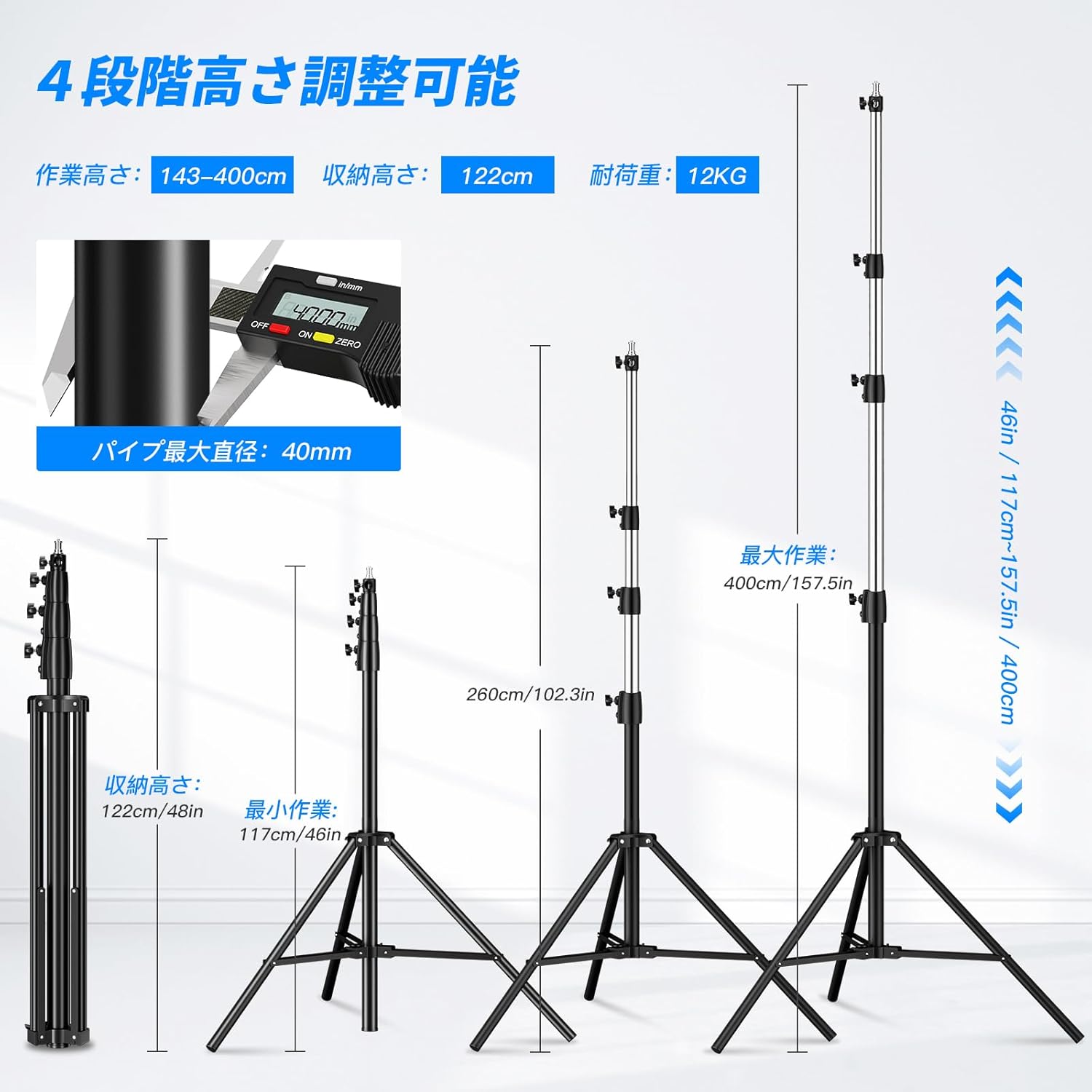 4Mヘビーデューティライトスタンド ストロボスタンド 耐荷重12kg 4段階調整
