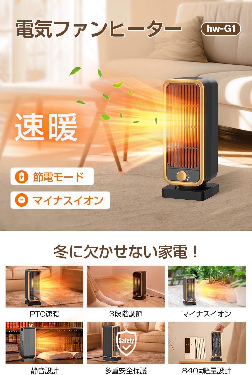 電気ファンヒーター 省エネ 高濃度マイナスイオン空気清浄 3段階温度調節 転倒OFF